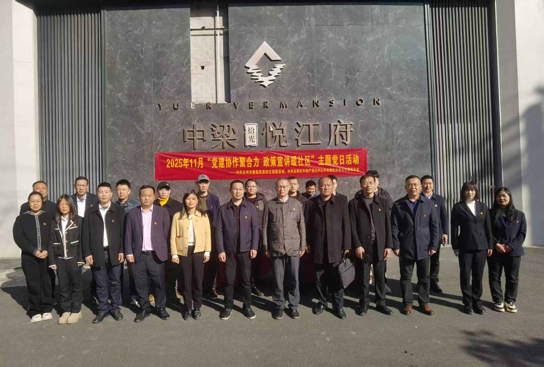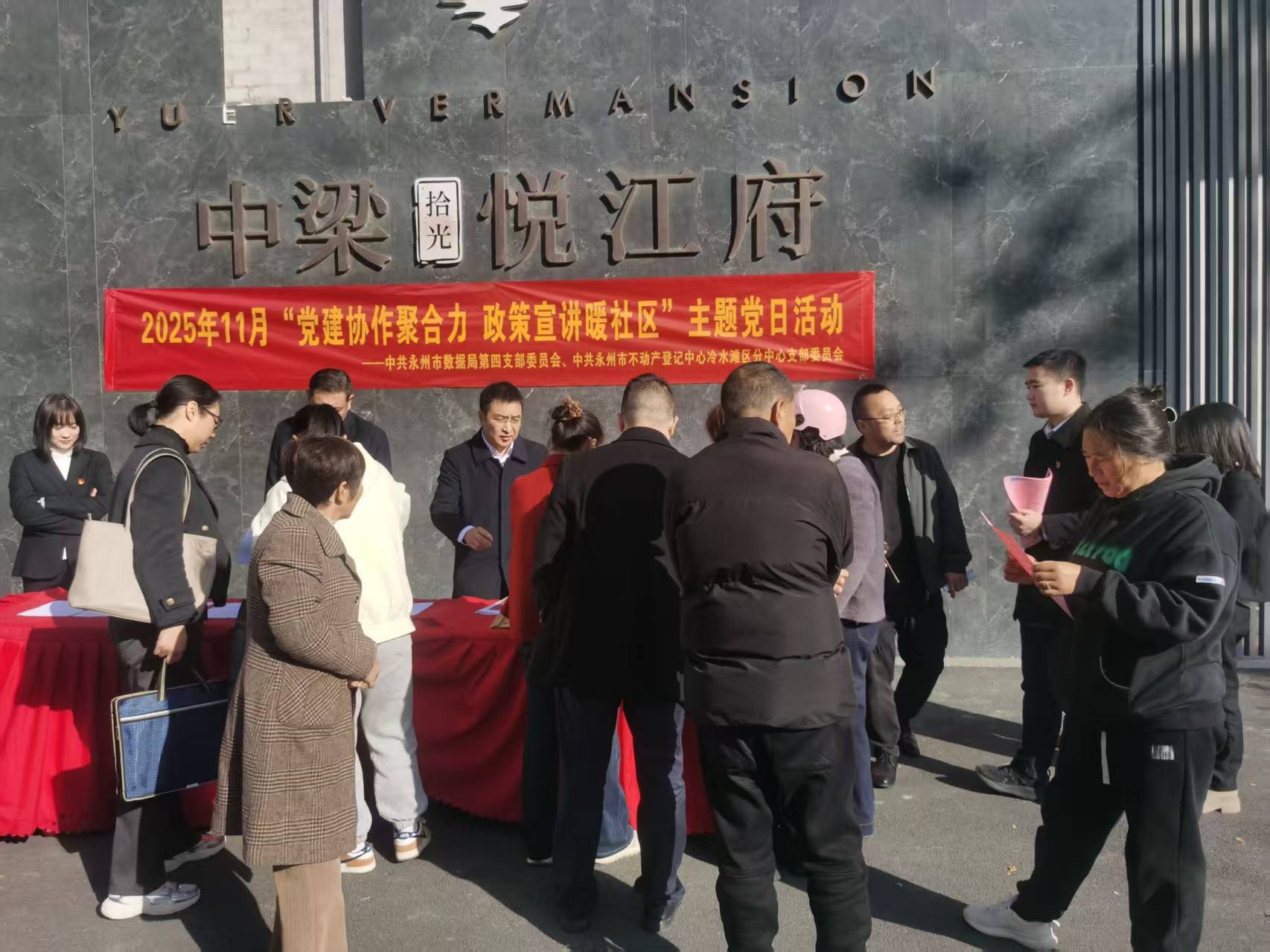 11月28日上午,永州市不动产登记中心冷水滩区分中心党支部联合永州市数据局第四党支部,在冷水滩区中梁悦江府小区广场开展“党建协作聚合力,政策宣讲暖社区”主题党日活动,现场为居民提供不动产登记政策解读与办事指导。