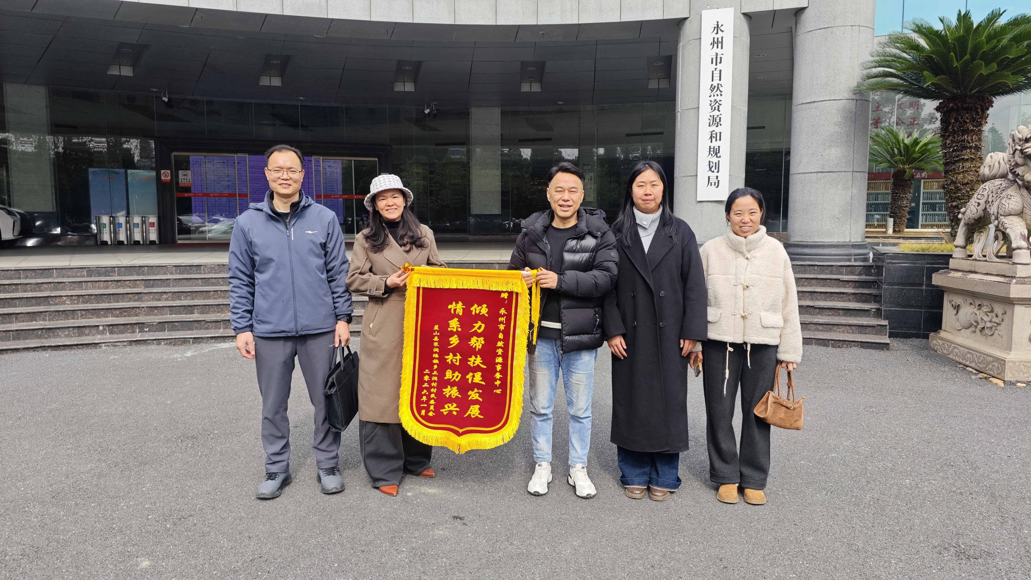 近日,蓝山县浆洞瑶族乡上洞村党支部书记、村委会主任陈梦思与村民代表一行,专程将一面印着“倾力帮扶促发展 情系乡村助振兴”的锦旗送至永州市自然资源事务中心,对该中心在乡村振兴工作中提供的帮扶表示感谢。