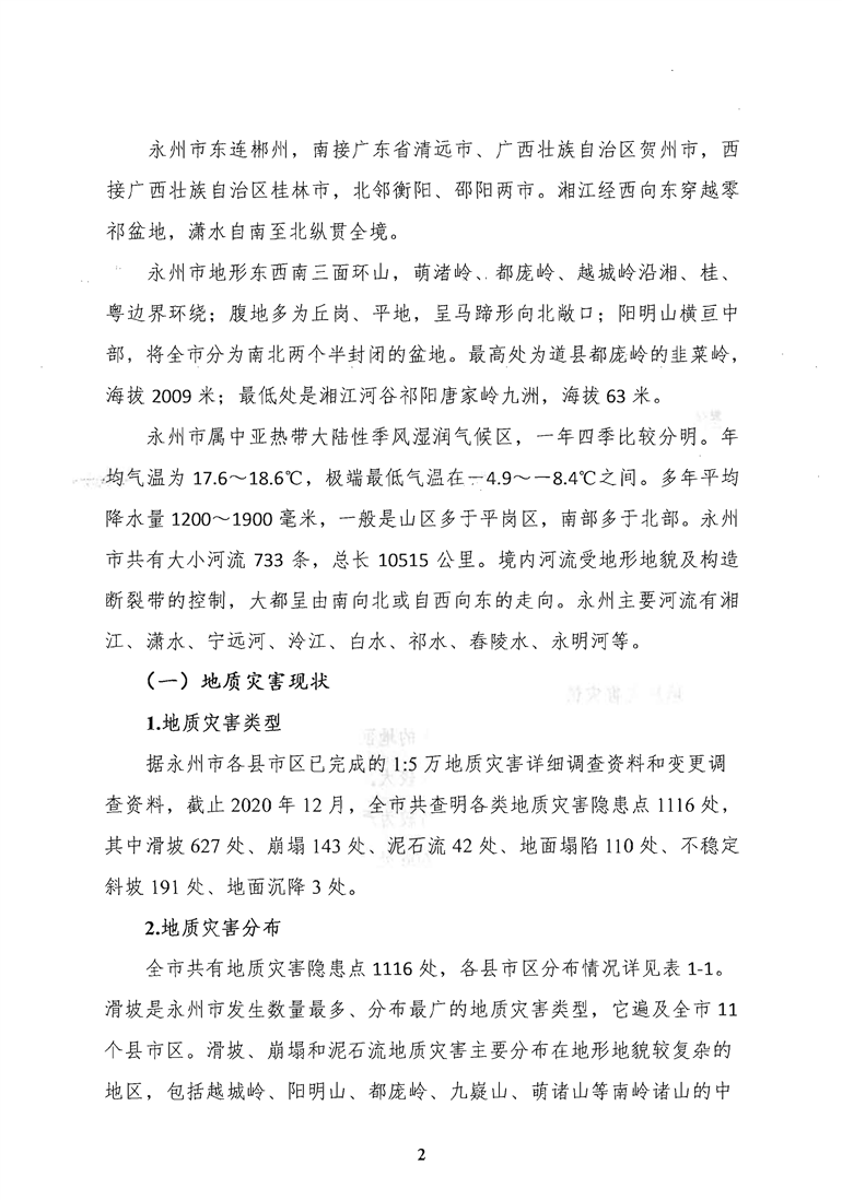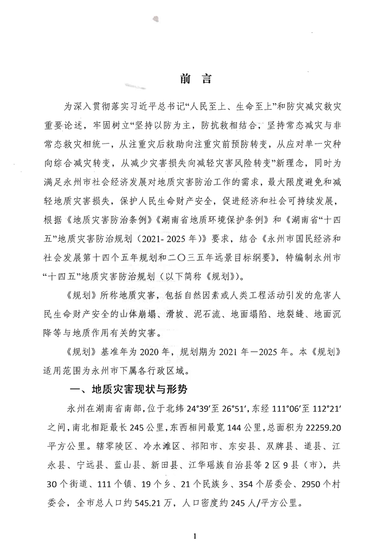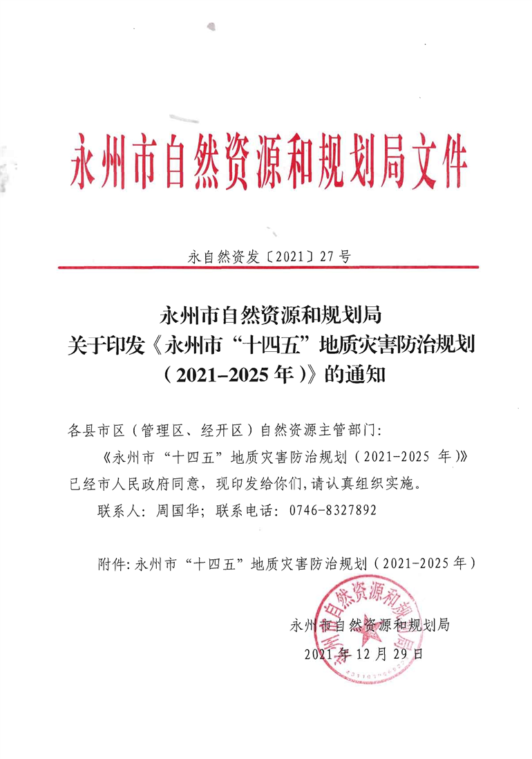 博彩网址导航关于印发《永州市“十四五”地质灾害防治规划(2021-2025年)》