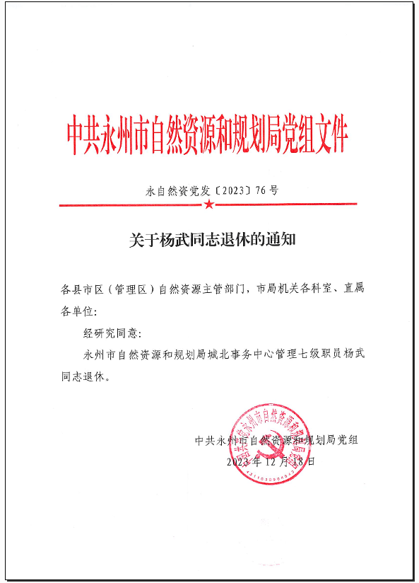 名称: 关于杨武同志退休的通知