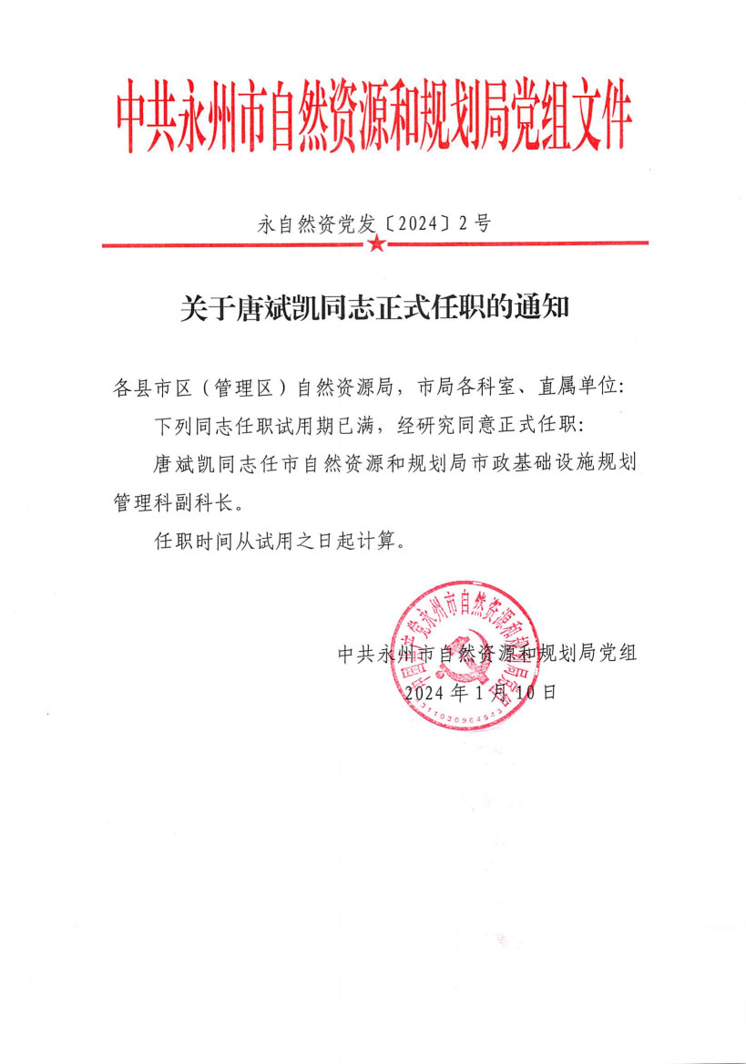 关于唐斌凯同志正式任职的通知