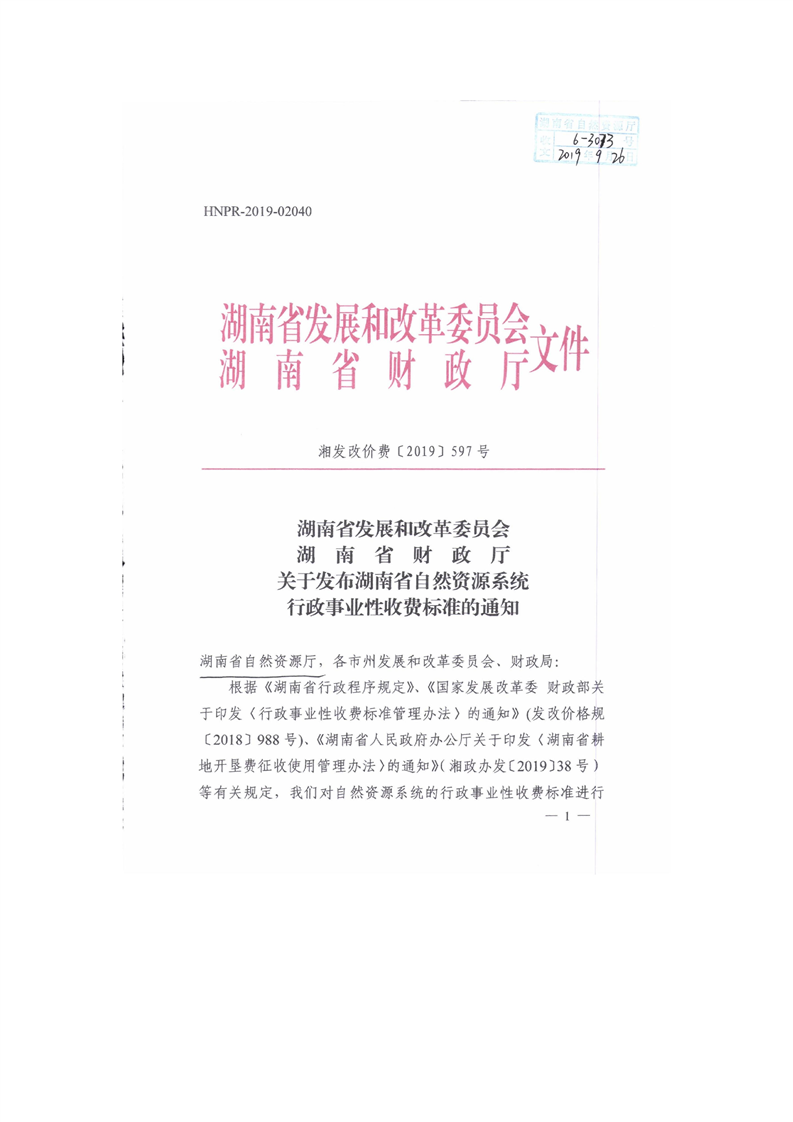 名称: 关于发布湖南省自然资源系统行政事业性收费标准的通知(湘发改价费[2019]597号)
