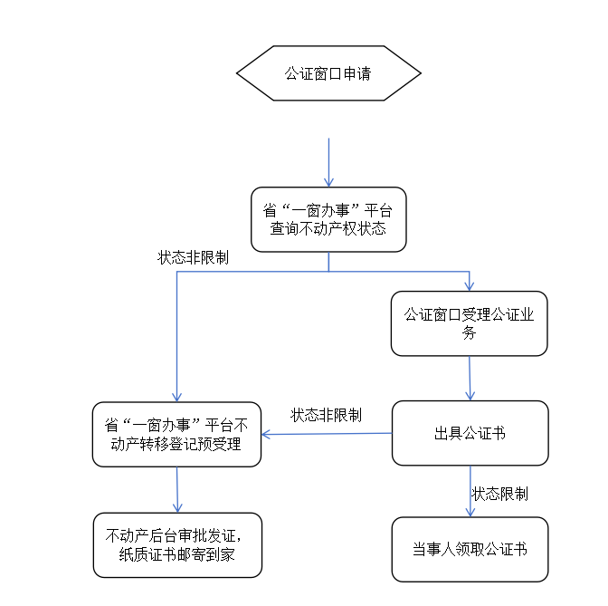 线下申请:申请人到永州市潇湘公证处窗口,由窗口工作人员先行办理公证业务,待办结后通过省“一网通办”系统进入湖南省不动产登记网上“一窗办事”平台办理并上传相关资料完成不动产转移登记申请。