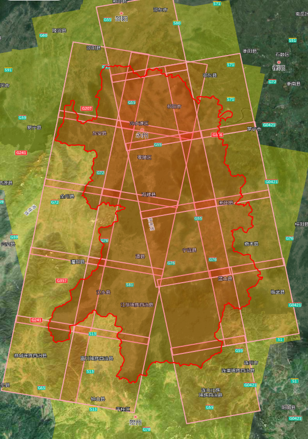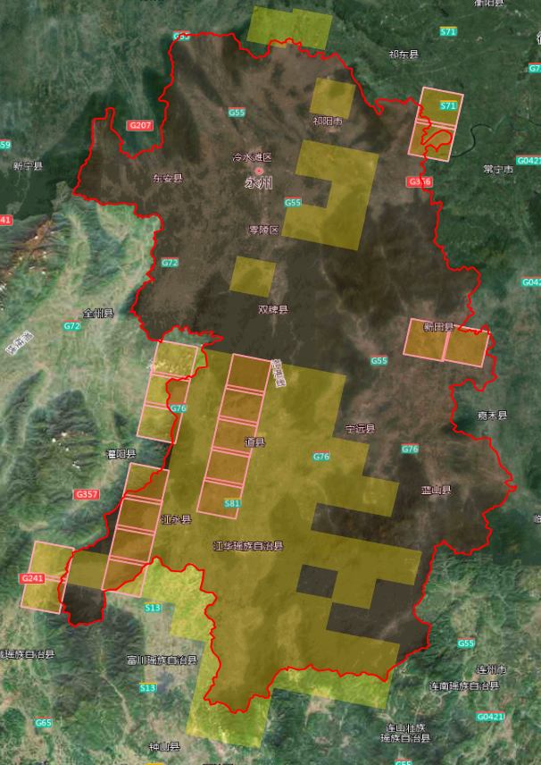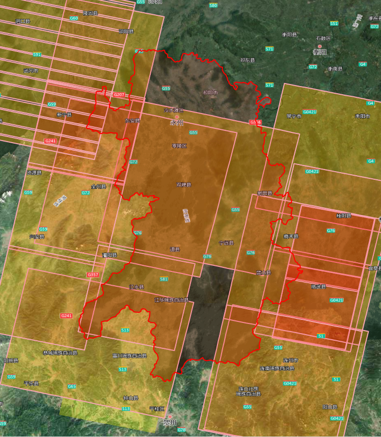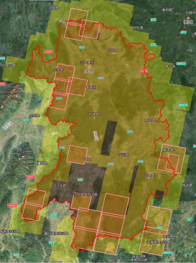 2米分辨率影像共21景,覆盖零陵区、新田县、双牌县、江永县全部区域;祁阳市、冷水滩区、东安县、江华县、宁远县、蓝山县、道县部分区域: